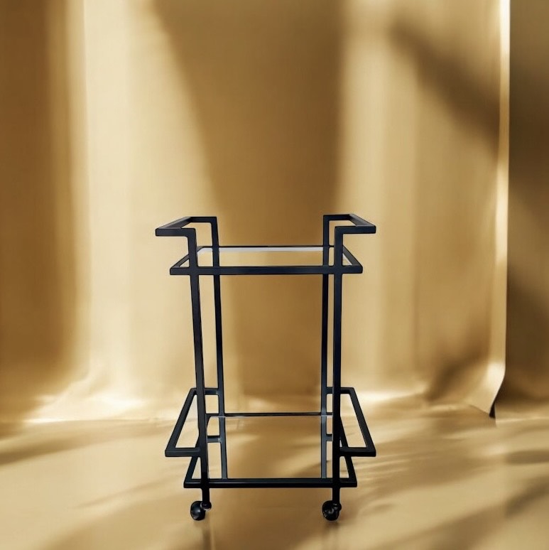 Este elegante carro combina estilo y practicidad, dos cubiertas en vidrio, equipado con ruedas suaves y bloqueables que permiten un movimiento fluido, facilitando el transporte del carro de un lugar a otro.
